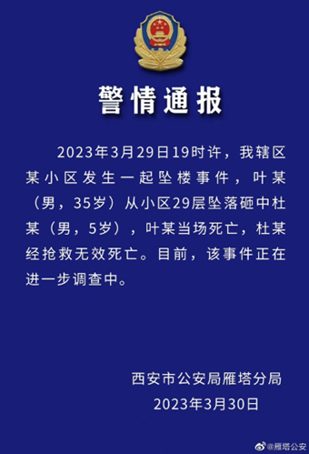 正观新闻消息,3月29日晚,“西安一男子坠楼砸中一名5岁男童,两人均不幸身亡”一事引发热议。30日0时46分,雁塔公安发布警情通报称,坠楼男子为35岁的叶某,被砸中男童为5岁的杜某,叶某当场死亡,杜某经抢救无效死亡,事件正在进一步调查中。