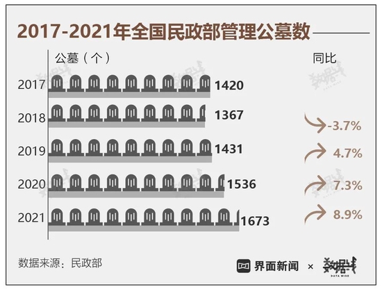 近年来,墓地供应量越来越多、增长越来越快。截至2021年,民政部门管理的公墓数量连续3年增加,增速从不到5%涨到8.9%。