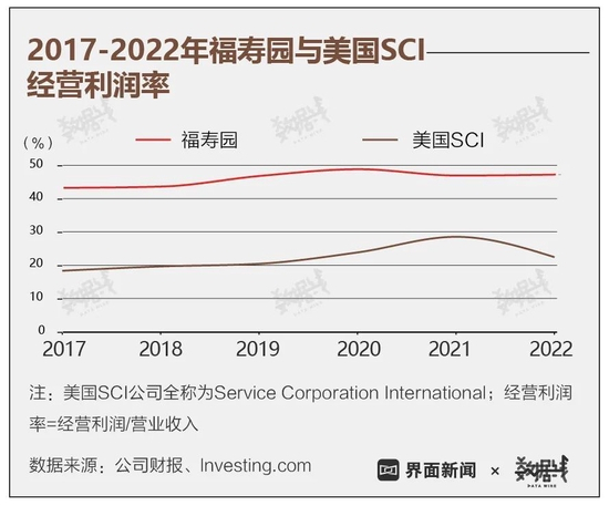从经营利润率来看,2017年至2022年,福寿园经营利润率始终高于美国SCI公司,一直在4成以上。截至2022年,福寿园经营利润率为47.4%,比同期美国SCI公司高出1倍多。