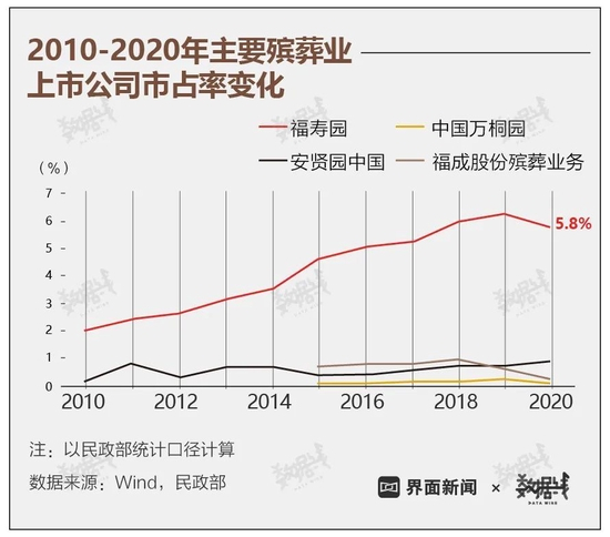 截至2020年,国内殡葬业相关上市公司中,福寿园市占率达5.8%,远高于其他企业。