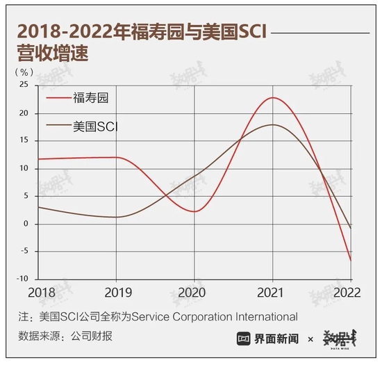 据艾媒数据中心,2019年美国丧葬服务企业中,美国SCI公司(Service Corporation International)所占比例为10.8%。据此,界面数据选取福寿园与美国SCI公司两家殡葬业龙头企业财报进行对比。