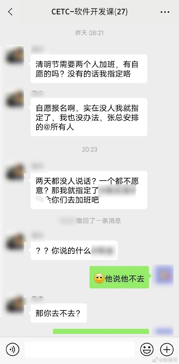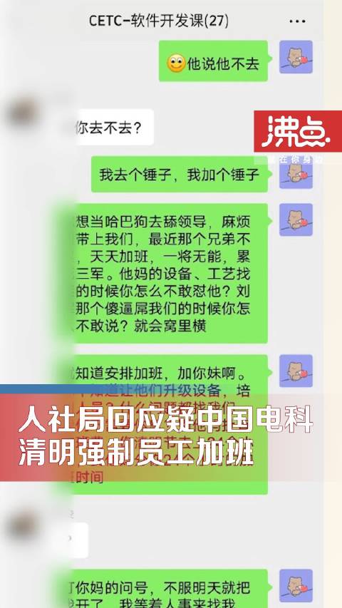 4月4日,疑似“中国电科(CETC)清明节强制加班怒怼领导”的相关聊天记录在网上流传开来。