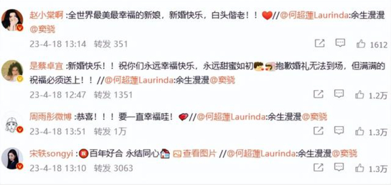 女方这边的好友宋轶、赵小棠、周雨彤、蔡卓宜等人也送上祝福:“全世界最美最幸福的新娘,新婚快乐白头偕老!”