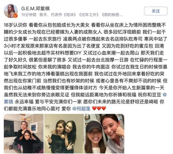 邓紫棋也发文祝福何超莲:“远距离地为你祈祷和祝福,祝你和豆豆(窦骁)永远幸福”。