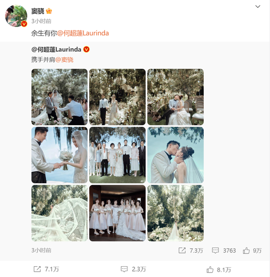窦骁晒出9张婚礼照写道:“三餐四季。”随后,何超莲转发窦骁微博回应:“余生漫漫。”