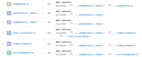现为存续状态的上海蔸蔻影视策划中心(普通合伙)成立于2015年4月,窦骁持股80%,为大股东及最终受益人。通过直接或间接持股,窦骁拥有北京蔸蔻商贸有限公司、北京艾乐思美容管理有限公司等6家公司的实际控制权,版图涉及影视、传媒、商贸、科技等。