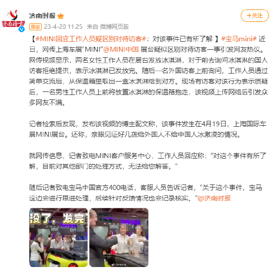 [#MINI回应工作人员疑区别对待访客#:对该事件已有所了解 ]#宝马mini# 近日,网传上海车展“MINI”@MINI中国 展台疑似区别对待访客一事引发网友热议。网传视频显示,两名女性工作人员在展台发放冰淇淋,对于前去询问冰淇淋的国人访客拒绝提供,表示冰淇淋已发放完。随后一名外国访客上前询问,工作人员通过简单交流后,从保温箱里取出一盒冰淇淋给到对方。现场有访客对该行为表示质疑后,一名男性工作人员上前将放置冰淇淋的保温箱抱走,该视频上传网络后引发众多网友不满。
