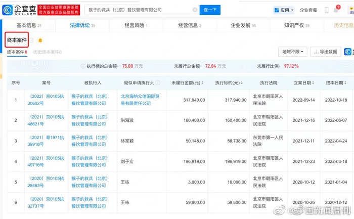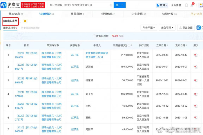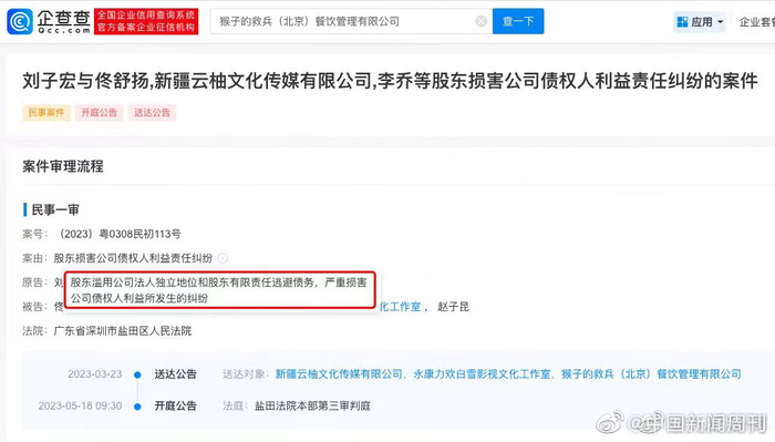 [张继科茶饮品牌债务逃避案将开庭]企查查APP显示,近日,张继科作为联合创始人的品牌猴子的救兵(北京)餐饮管理有限公司新增一则开庭公告,案由为股东损害公司债权人利益责任纠纷,开庭时间为5月18日,开庭法院为广东省深圳市盐田区人民法院。企查查信息显示,猴子的救兵(北京)餐饮管理有限公司成立于2018年8月,注册资本约116万元人民币,法定代表人赵子昆。值得关注的是,该公司已存在多条限制高消费、终本案件信息。(九派新闻)