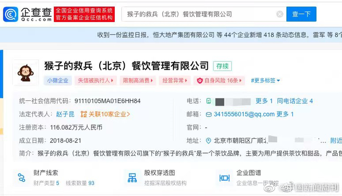 企查查APP显示,加盟商曝出的奶茶品牌隶属于猴子的救兵(北京)餐饮管理有限公司,该公司成立于2018年,公司实控人已七次被限制高消费,2021年5月被北京市朝阳区市场监督管理局列为经营异常。企查查信息显示,目前该公司并未查询到张继科持股的情况,不过,据媒体公开报道,其股份由亲人代持。此外,猴子的救兵茶饮官微曾宣称,公司为张继科联合创始的品牌。