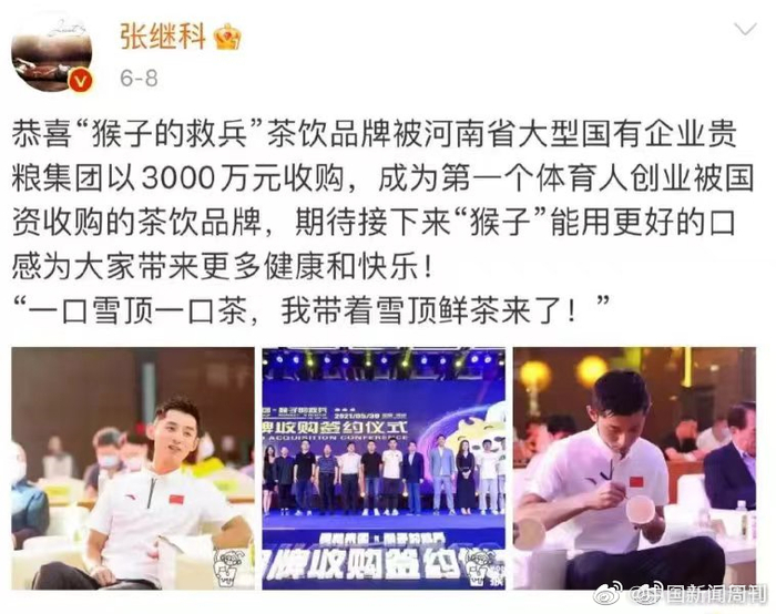 张继科的创业之路不是非常顺利。有网友爆料称,自己加盟了张继科联合创立的奶茶品牌“猴子的救兵”,但该品牌存在虚假宣传、未进行特许经营备案等情况,使得自己损失了近5万元。