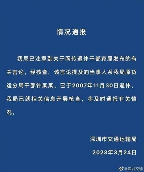 3月24日下午,深圳市交通运输局发出情况通报称,该局已注意到关于网传退休干部家属发布的有关言论,经核查,该言论提及的当事人系该局原货运分局干部钟某某,已于2007年11月30日退休,该局已就相关信息开展核查,将及时通报有关情况。