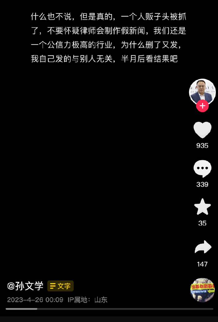 孙文学律师通过社交平台发声表示,“不要怀疑律师会制作假新闻,我们还是一个公信力极高的行业,为什么删了又发,我自己发的与别人无关,半月后看结果吧。”