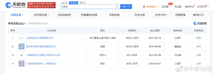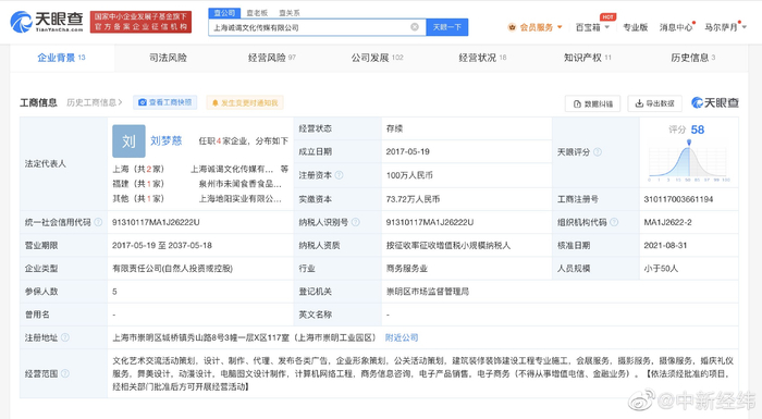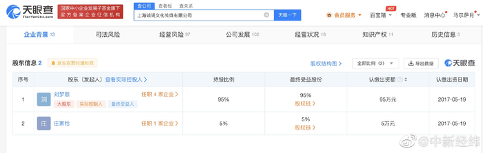 天眼查App显示,“杰克辣条”所属经纪公司上海诚谒文化传媒有限公司成立于2017年5月,注册资本100万人民币,法定代表人、执行董事及第一大股东为刘梦慈,持股比例95%,其名下除该公司外,还有食品公司、实业公司。2022年年报显示,诚谒文化传媒公司共5人参保。