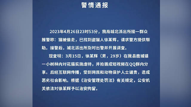 29岁男子虐猫并拍短视频在QQ群分享 被警方治安拘留