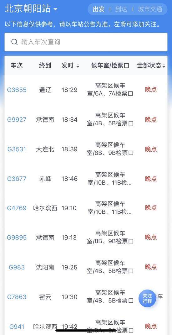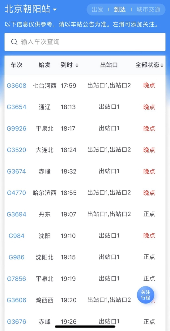 北京朝阳站车站大屏列车信息显示,今日到达车站的多趟京哈高铁列车不同程度晚点,从晚点几十分钟到晚点近俩小时。同时,今晚从北京朝阳站出发的列车也受到一定影响,终到通辽、大连北、哈尔滨西方向列车出现晚点,请旅客关注车站公告。