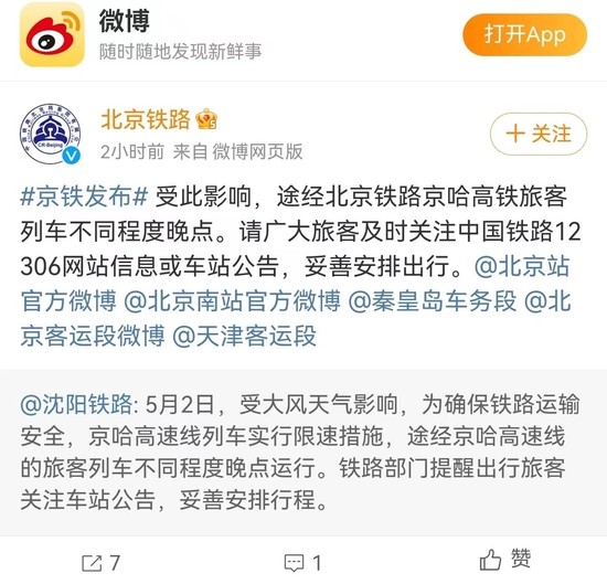 随后,北京铁路官方微博转发该通知称,“受此影响,途经北京铁路京哈高铁旅客列车不同程度晚点。请广大旅客及时关注中国铁路12306网站信息或车站公告,妥善安排出行。”