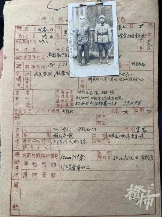 他发现一张田春山烈士遗照和一张《烈士家属登记表》被作为商品出售。