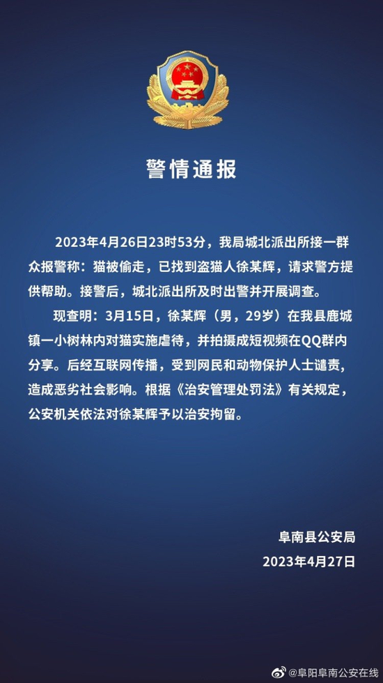 4月27日,阜南县公安局发布警情通报证实,经查明,3月15日,徐某辉(男,29岁)在阜南县鹿城镇一小树林内对猫实施虐待,并拍摄成短视频在QQ群内分享。后经互联网传播,受到网民和动物保护人士谴责,造成恶劣社会影响。根据《治安管理处罚法》有关规定,公安机关依法对徐某辉予以治安拘留。