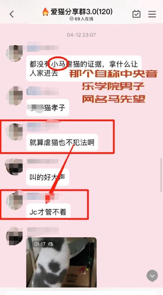 有网友还曝出聊天截图,他为曾自称中央音乐学院的贩卖虐猫视频和淫秽视频的男子站台,并称虐猫不犯法。