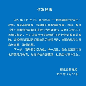2023年5月25日,网传我县“一教师脚踢拉扯学生”视频。我局高度重视,迅速组织开展调查处置。目前,根据《中小学教师违反职业道德行为处理办法 (2018 年修订)》等相关规定,已对该编外合同教师许某进行批评教育并解聘。该教师已深刻认识到自己的错误行为,当面向该学生及家长道歉,取得谅解