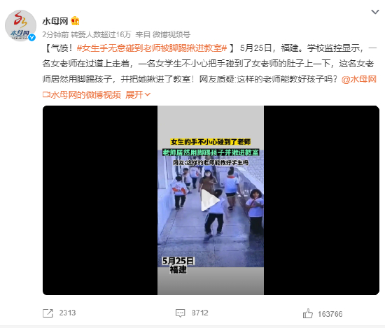 5月25日,福建。学校监控显示,一名女老师在过道上走着,一名女学生不小心把手碰到了女老师的肚子上一下,这名女老师居然用脚踢孩子,并把她揪进了教室!网友质疑:这样的老师能教好孩子吗?