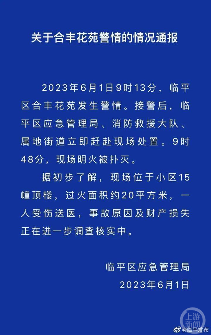当天,临平区应急管理局发布通报称,9时48分,现场明火被扑灭。现场过火面积约20平方米,一人受伤送医,事故原因以及财产损失正进一步调查核实中。