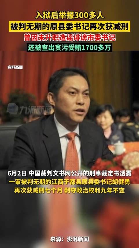 [#被判无期的原县委书记再获减刑#,知情人:狱中交代多人违法违纪行为,列举了300多人]6月2日,中国裁判文书网公开的刑事裁定书透露,一审被判无期的江西于都县原县委书记胡健勇再次获减刑七个月,剥夺政治权利九年不变。2011年,因自己未被列为拟提任副厅级干部人选,他通过短信、匿名书信、网站发帖等方式对时任市委书记进行造谣污蔑后被免职,之后其严重经济问题也浮出水面。2012年6月20日,胡健勇因贪污受贿及巨额财产来源不明,被赣州市中级人民法院判处无期徒刑,追缴赃款人民币1713万元。服刑期间,江西省高级人民法院于2017年3月30日对其减为有期徒刑二十二年。2019年9月30日,对其减去有期徒刑八个月二十天,剥夺政治权利九年不变。知情人士称,他曾在狱中写举报信,交代多人违法违纪行为,列举了300多人。@九派新闻
