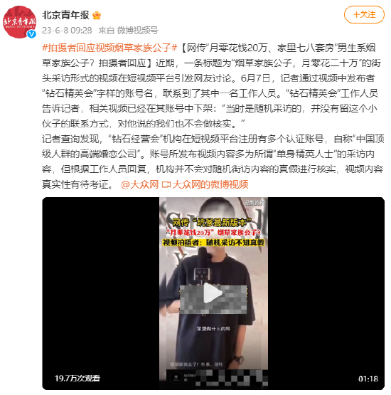 #拍摄者回应视频烟草家族公子#[网传“月零花钱20万、家里七八套房”男生系烟草家族公子?拍摄者回应]近期,一条标题为“烟草家族公子,月零花二十万”的街头采访形式的视频在短视频平台引发网友讨论。6月7日,记者通过视频中发布者“钻石精英会”字样的账号名,联系到了其中一名工作人员。“钻石精英会”工作人员告诉记者,相关视频已经在其账号中下架:“当时是随机采访的,并没有留这个小伙子的联系方式,对他说的我们也不会做核实。”