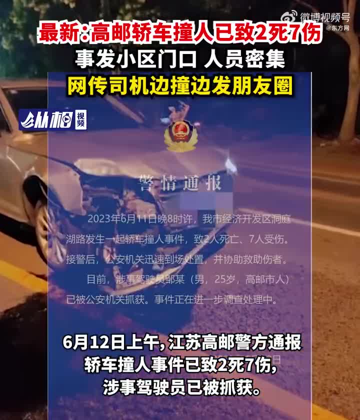 [高邮发生轿车撞人事件致2死7伤 高邮肇事者疑边撞边发朋友圈]6月12日上午,江苏高邮警方通报轿车撞人事件已致2死7伤,涉事驾驶员已被抓获。记者了解到,该事故发生时间约为11日20时许,事发地点位于高邮开发区秦邮茗都小区门口。该小区系当地回迁房,事发时正值散步高峰期,路上有较多行人。有目击者称,疑似肇事司机邹某就住在秦邮茗都小区,应该是有预谋的撞人,网传多张疑似肇事者的微信截图,边撞还边发朋友圈。(东方网)