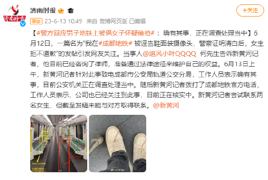 [#警方回应男子地铁上被俩女子怀疑偷拍# :确有其事,正在调查处理当中]6月12日,一篇名为“我在#成都地铁# 被诬告鞋面装摄像头,警察证明清白后,女生拒不道歉”的发帖引发网友关注。当事人@追风小叶QQQQ 何先生告诉新黄河记者,他目前已经咨询了律师,准备通过法律途径来维护自己的权益。6月13日上午,新黄河记者针对此事致电成都市公安局轨道公交分局,工作人员表示确有其事,目前公安机关正在调查处理当中。随后新黄河记者拨打了成都地铁官方电话,工作人员表示,公司也已经关注到此事,目前正在核实中。新黄河记者尝试联系两名女生,但截至发稿未能与对方取得联系。@新黄河