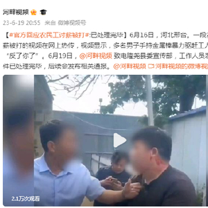 6月16日,河北邢台。一段农民工讨薪被打的视频在网上热传,视频显示,多名男子手持金属棒暴力驱赶工人,并叫嚣“反了你了”。6月19日,@河畔视频 致电隆尧县委宣传部,工作人员表示,该事件已处理完毕,后续会发布相关通报。