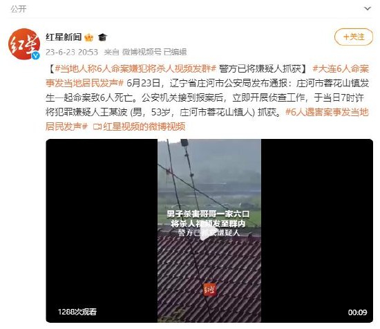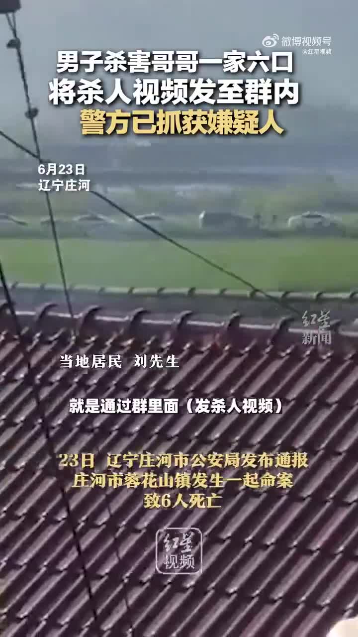 【#当地人称6人命案嫌犯将杀人视频发群# 警方已将嫌疑人抓获】 #大连6人命案事发当地居民发声# 6月23日,辽宁省庄河市公安局发布通报:庄河市蓉花山镇发生一起命案致6人死亡。公安机关接到报案后,立即开展侦查工作,于当日7时许将犯罪嫌疑人王某波 (男,53岁,庄河市蓉花山镇人) 抓获。