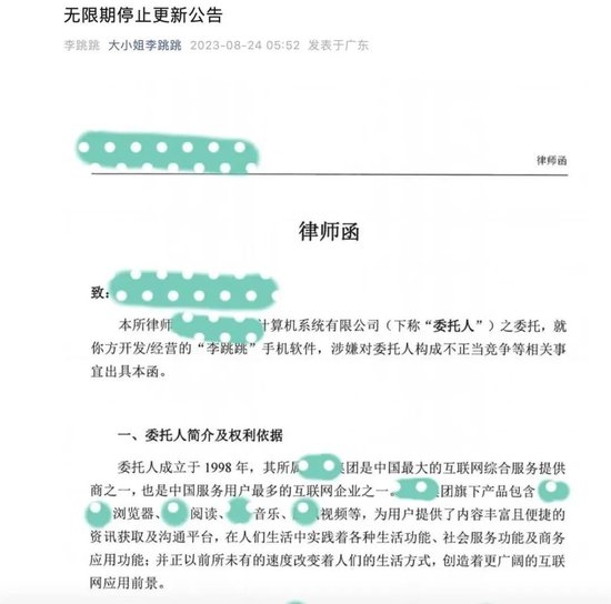 8月24日,自动跳过各类App开屏广告的安卓平台应用软件“李跳跳”对外宣称,将无限期停止更新。原因是他们收到一份来自国内某互联网大厂的律师函。