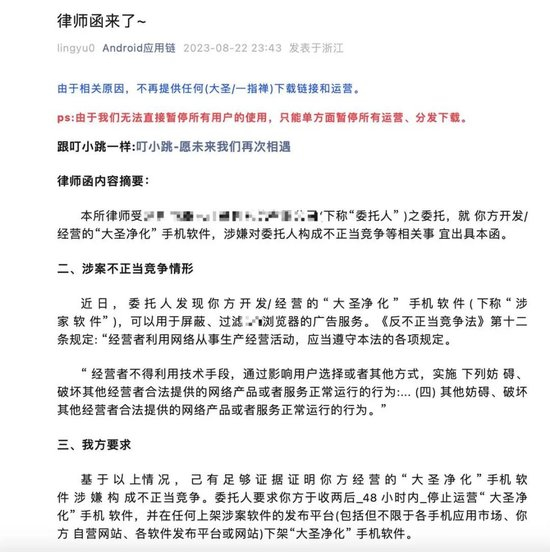 其公众号上披露的纸质律师函图片显示,涉案软件“可用于屏蔽、过滤某浏览器的广告服务”“吸引用户下载并使用涉案软件,使其不正当取得竞争优势……破坏了合法竞争秩序和机制,并最终造成消费者福祉的减损”。对方要求在收函48小时内停止运营、下架“叮小跳”App。