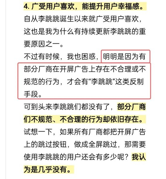 不过开发者也表示,因为自身行为导致厂商收入减少,至少是不道德的行为。但因为有的厂商也不道德,使用户难以第一时间跳过广告,“比如假的跳过按钮、多个‘跳过’按钮、多重开屏广告、诱导点击等等。因为有部分厂商在开屏广告上存在不合理或不规范的行为,才会有‘李跳跳’这类反制手段。”