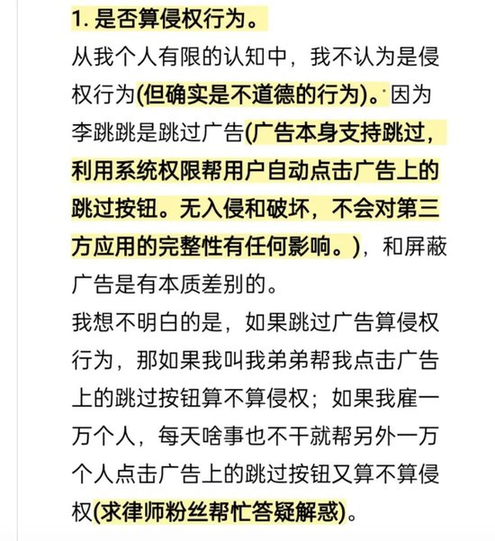 “李跳跳”APP的开发者则介绍,这是一款公益性质的单机软件,没有联网,也没有盈利,不存在“大厂”控告中所说的经营行为。至于App的功能,是跳过广告而非屏蔽广告,不会对第三方App完整性有任何影响。