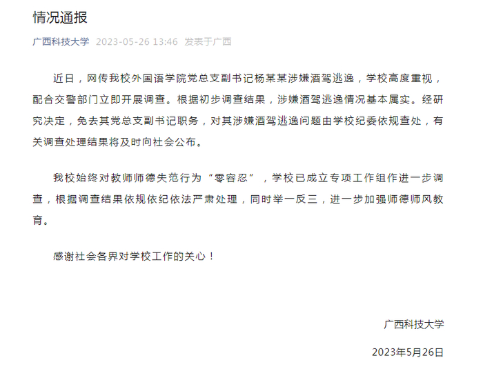 5月26日,广西科技大学发布通告称,根据初步调查结果,涉嫌酒驾逃逸情况基本属实。经研究决定,免去其党总支副书记职务,对其涉嫌酒驾逃逸问题由学校纪委依规查处,有关调查处理结果将及时向社会公布。