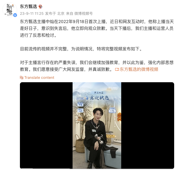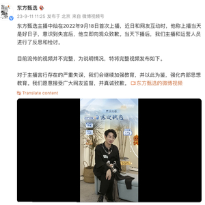 9月11日,东方甄选发布致歉声明称,东方甄选主播中灿在2022年9月18日首次上播,近日和网友互动时,他称上播当天是好日子,意识到失言后,他立即向观众致歉。当天下播后,主播和运营人员进行了反思和检讨。“对于主播言行存在的严重失误,我们会继续加强教育,并以此为鉴,强化内部思想教育。我们愿意接受广大网友监督,并真诚致歉。”