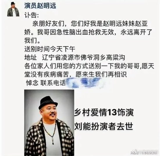 赵明远妹妹发布讣告