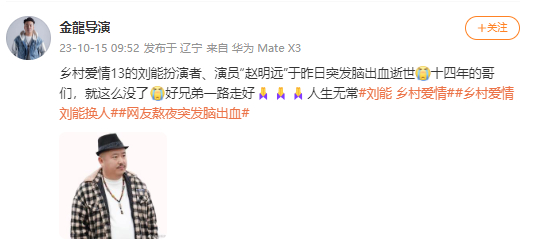 10月15日,《乡村爱情》官方、金龙导演及本山传媒演员金燕发文悼念。