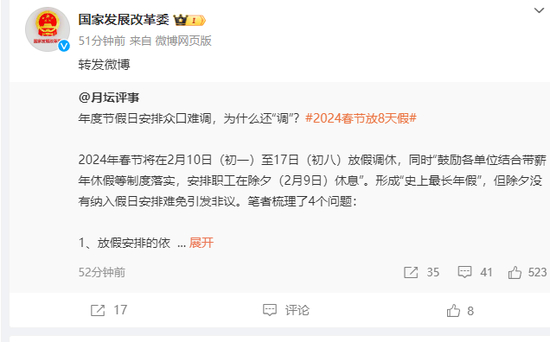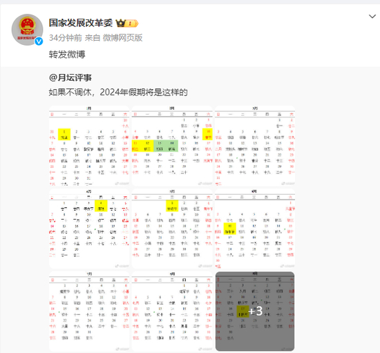 另外值得一提的是,今天上午,国家发展改革委官方微博连续转发多条微博,解读2024年放假安排。