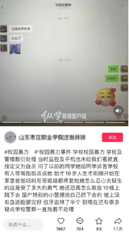 山东枣庄一名19岁女生在校死亡,校方:公安已勘查,学生系跳楼身亡,遗书也可证明