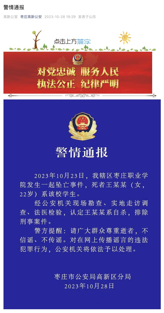 山东枣庄一女生在校坠亡,警方通报:系自杀,排除刑事案件