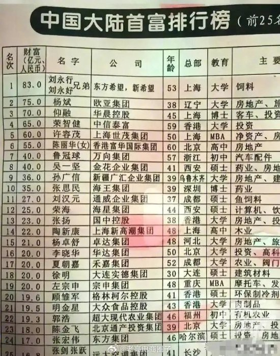 昨天,偶然发现一张2001年福布斯发布的中国内地富豪排行榜(前25名),这是一张进入新世纪中国“入世”时的第一份富豪榜,同时也是草根人士刘永行刘永好兄弟成为中国首富(前两届首富为荣毅仁)的榜单。