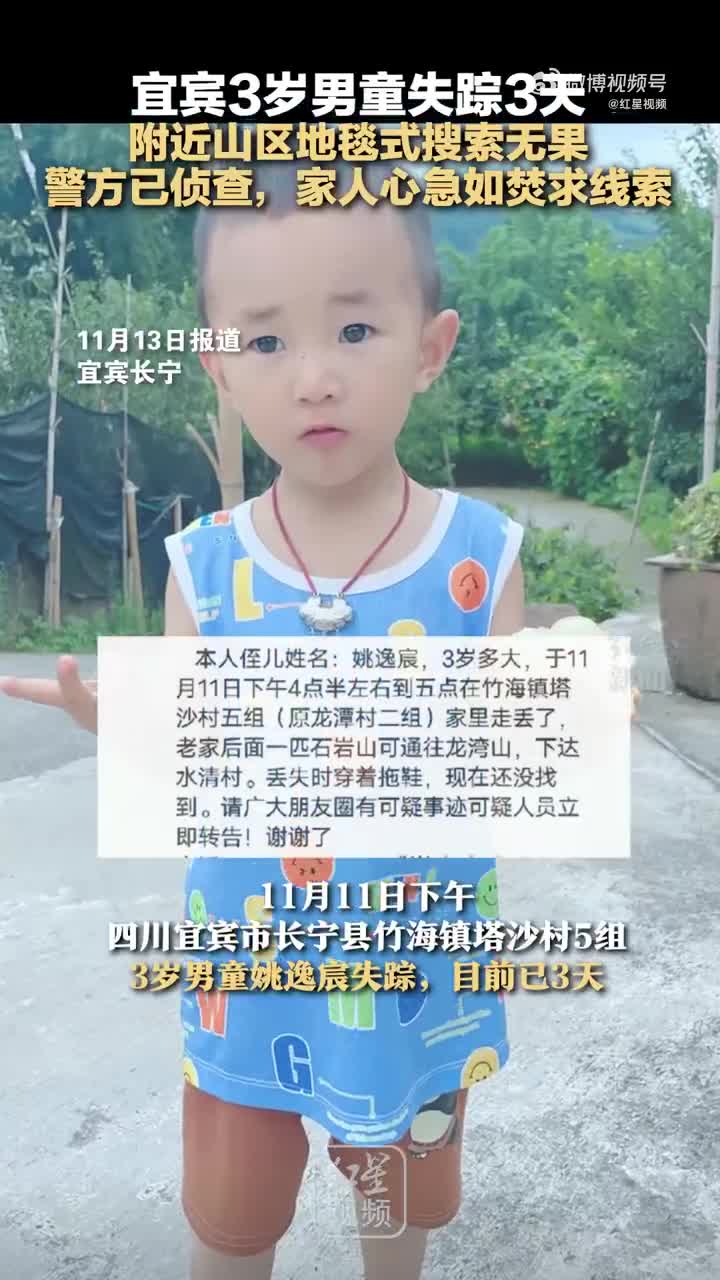 宜宾3岁男童失踪3天 附近山区地毯式搜索无果 警方已侦查,家人心急如焚求线索