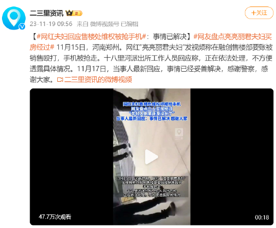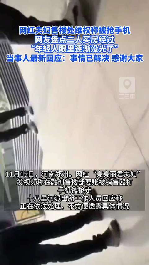 [#网红夫妇回应售楼处维权被抢手机#:事情已解决]#网友盘点亮亮丽君夫妇买房经过# 11月15日,河南郑州。网红“亮亮丽君夫妇”发视频称在融创售楼部要账被销售殴打,手机被抢走。十八里河派出所工作人员回应称,正在依法处理,不方便透露具体情况。11月17日,当事人最新回应,事情已经妥善解决,感谢警察,感谢大家。