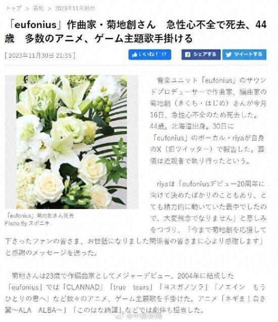 日本音乐家菊地创因急性心力衰竭于11月16日去世,享年44岁。菊地创曾参与《CLANNAD》《true Tears》《此花绮谭》等游戏、动画作品的音乐制作工作。音乐组合“eufonius”主唱Riya在社交媒体平台公布了这一消息。