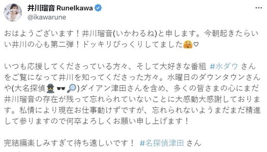 当日,井川瑠音生前所属经纪公司ENA娱乐发布声明,表达了对井川瑠音离世的悲痛和哀悼,也向一直关心和支持她的观众们表示了感谢。