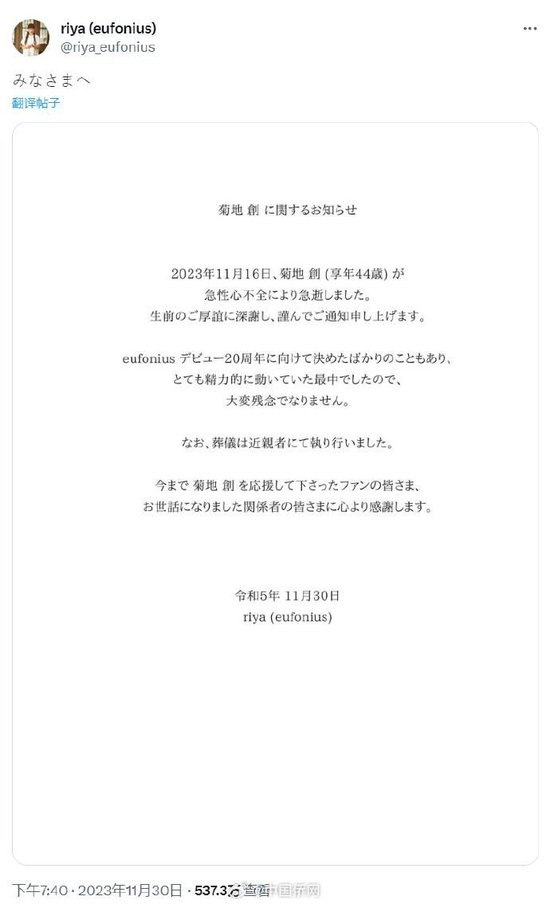 日本音乐家菊地创因急性心力衰竭去世