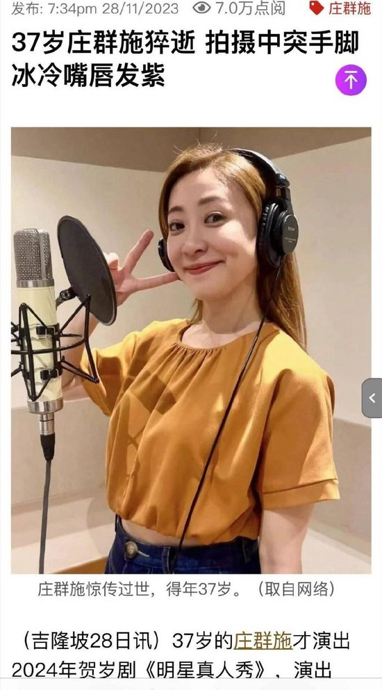 近日,37岁马来西亚女星庄群施在拍片途中突然头晕头痛呕吐,其从身体出现不适到猝逝仅约30分钟。